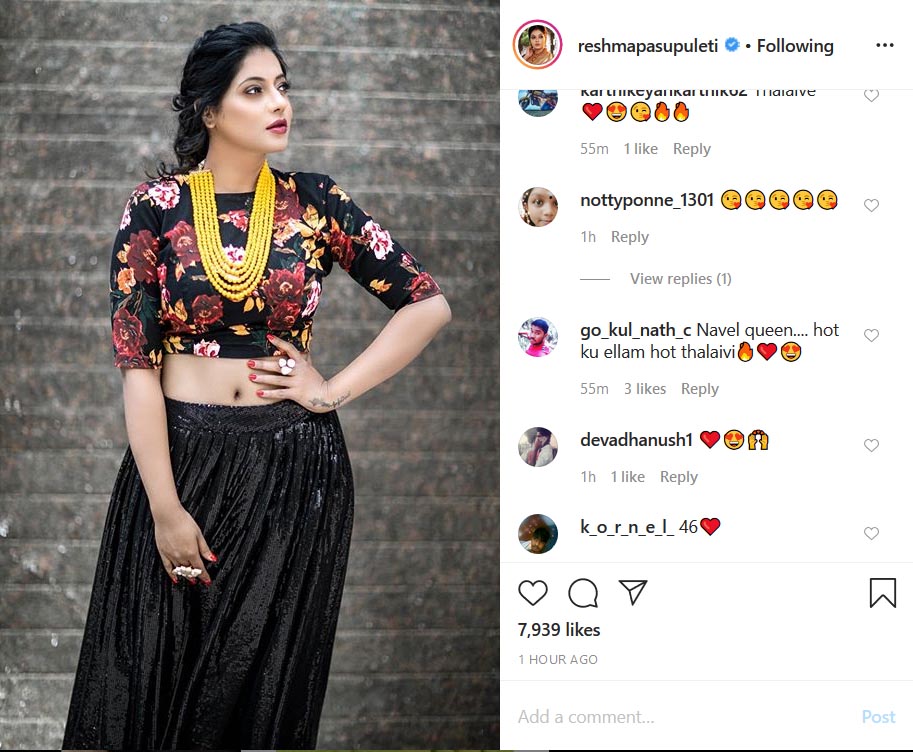 அதனை தொடர்ந்து, பிக்பாஸ் சீசன் 3 யில் க லந்துக்கொ ன்று மேலும் பிரபலமானார். இந்நிலையில் ரேஷ்மா தற்போது க வ ர்ச்சி உ டையில் தன்னுடைய தொப்புள் அ ழகு தெரியும் அளவுக்கு புகைப்படம் எடுத்து “பணிவுடன் நடந்து கொ ள் ளுங்க. இல்லையென்றால், வாழ்கை உங்ககளை பணிவுடன் நடக்க வைத்து விடும்” என கூறியுள்ளார். இதனை பார்த்த ரசிகர்கள் ஹா ட்டுக்கெல்லாம் ஹாட் என கமெண்ட் செய்துள்ளார்.