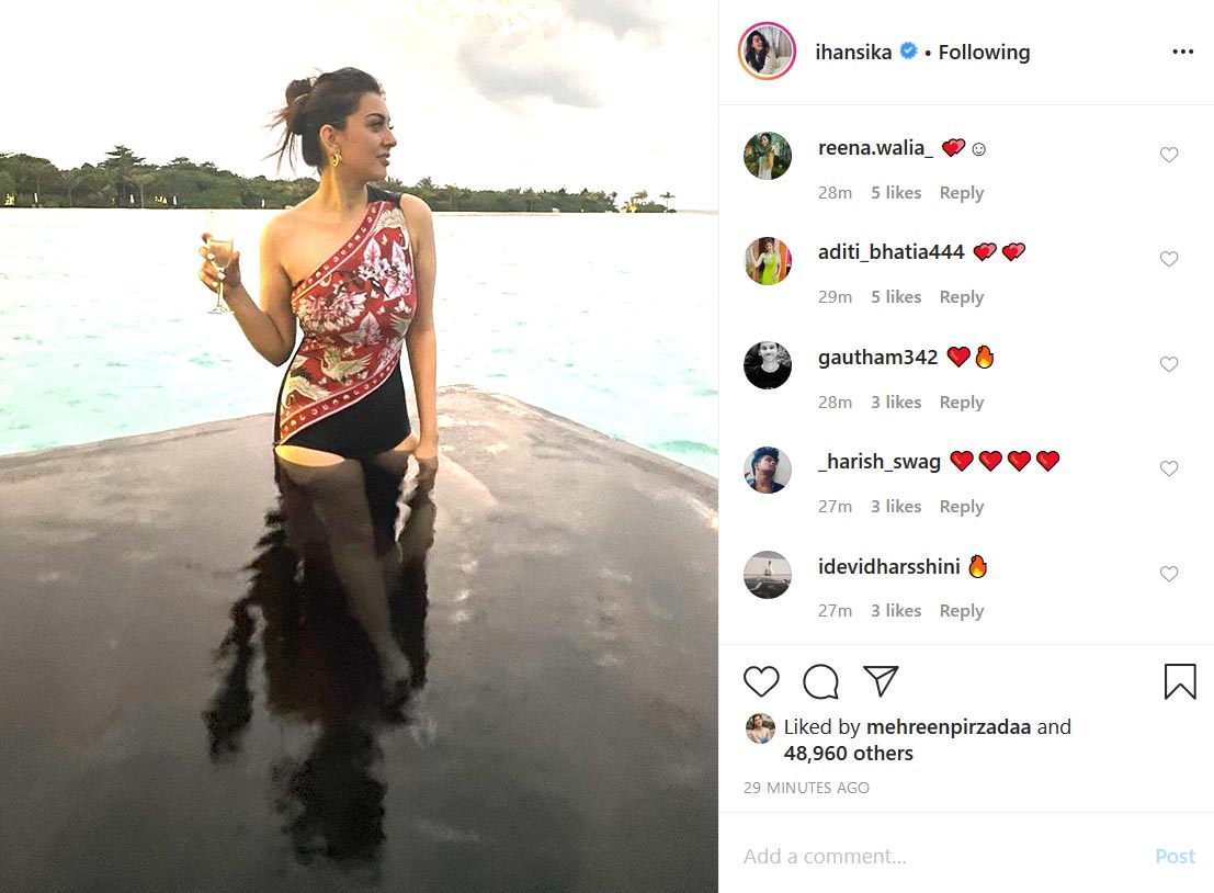 கையில் க்ளாஸுடன் பிகினி உடையில் நீச்சல் குளத்தில் நின்று கவர்ச்சி போஸ் கொடுத்த கொழு கொழு நடிகை ஹன்ஷிகா..!