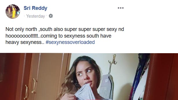 இந்நிலையில் ஸ்ரீ ரெட்டி தங்கியிருக்கும் வீட்டின் உரிமையாளர் வீட்டை காலி செய்யுமாறு கூறவே தற்போது சென்னையில் வந்து தங்கியுள்ளார் அம்மணி. தொடர்ந்து ஏதாவது ஒரு ச ர் ச் சையான பதிவை வெ ளியிடும் ஸ்ரீ ரெட்டி இப்போது தன்னுடைய டீ சர்ட்டை தூ க்கி வாயில் க டித்தப டி தன்னுடைய ஒரு பக்க மு ன்னழகு தெரியும்ப டி போஸ் கொடுத்துள்ளார். முழு புகைப்படத்தை அவருடைய முகநூல் பக்கத்தில் பார்க்கலாம்