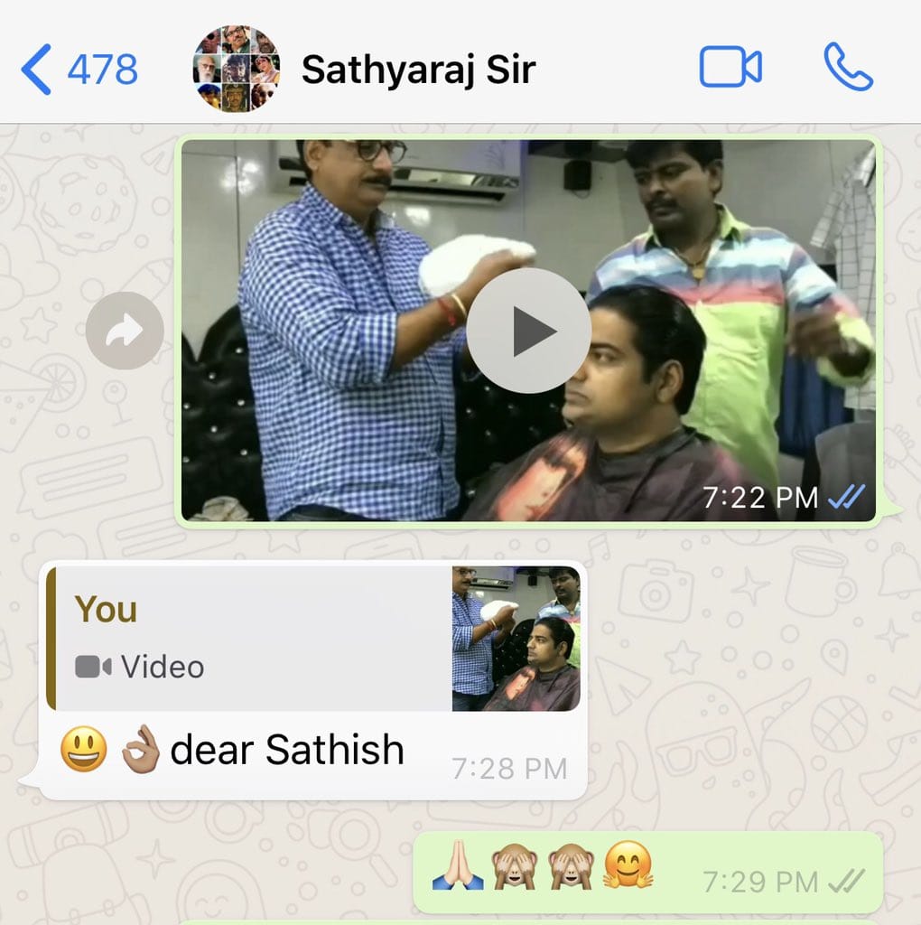 அதில் ஒன்று ‘நூறாவது நாள்’ படத்தில் மொட்டையடித்துக்கொண்டு ரெட் கலர் உடையில் வி ல் லனாக வந்த சத்யராஜின் கெட்டப். இந்த மேக் ஓவர் வீடியோவை இணையத்தில் வெ ளியிட்ட சதீஷிற்கு சத்தியராஜ் வாட்ஸ் ஆப்’ல் dear சதீஷ் சூப்பர்.. என்று மெஸேஜ் அனுப்பியிருக்கிறார். இதனை சதீஷ் மிகப் பெரிய விருது சத்யராஜ் சார் அவர்களிடமிருந்து என கூறி screen shot வெளியிட்டுள்ளார்.