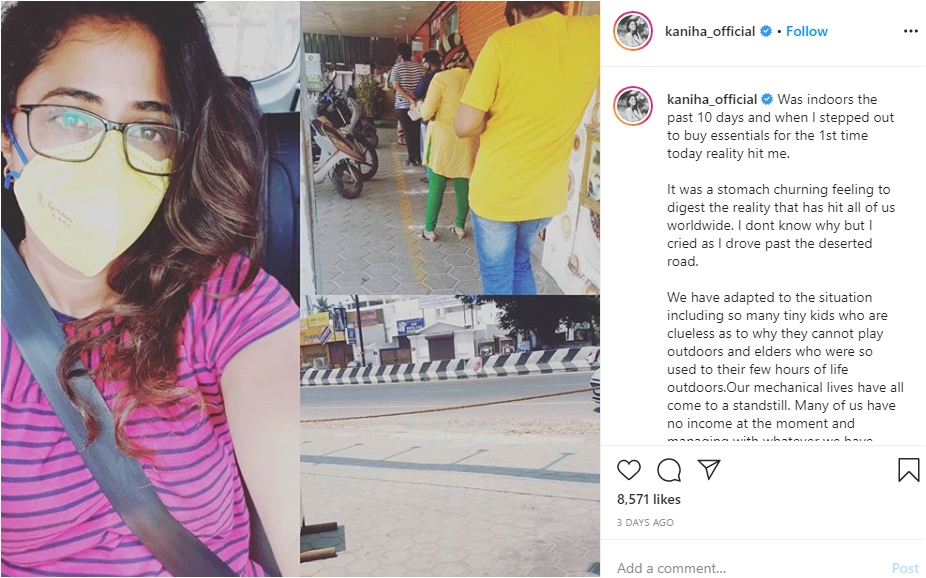 5 ஸ்டார் படத்தைநடிகர் பிரசன்னாவுக்கு ஜோடியாக நடித்திருந்தார் நடிகை கனிகா. அந்த படத்தில் மிகவும் அமைதியாக, அடக்கமான ஒரு பெண்ணாக நடித்திருப்பார் இவர். இந்நிலையில், ஊரடங்கு உத்தரவால் அத்தியாவசிய பொருட்களை வாங்க 10 நாட்களுக்கு பின் வெளியே வந்த நடிகை கனிகா தன்னுடைய அனுபவத்தை சமூகவலைத்தளத்தில் பகிர்ந்துள்ளார்.