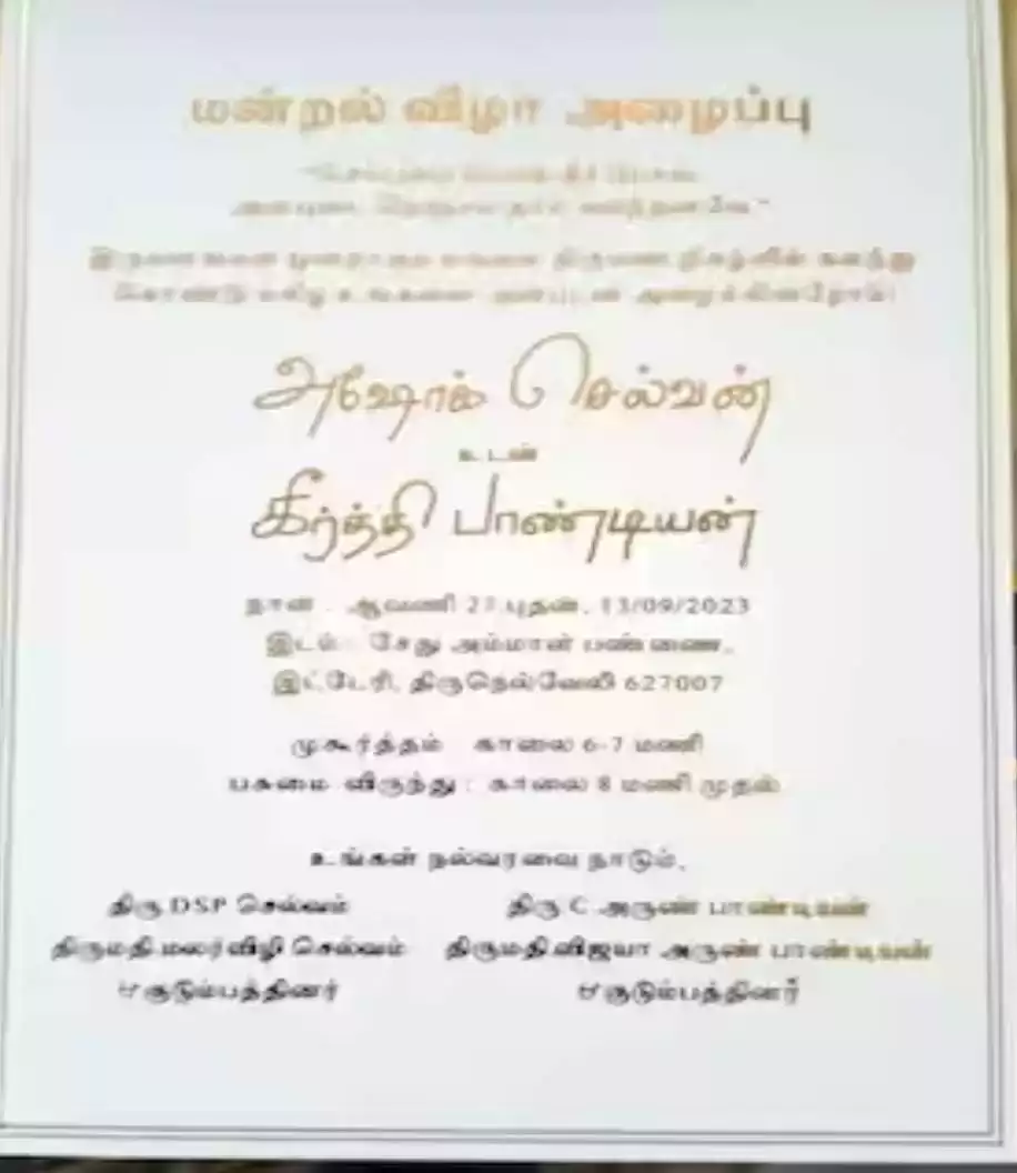 திருநெல்வேலி மாவட்டத்தில் உள்ள இன்டேரி என்ற கிராமத்தில் வருகின்ற செப்டம்பர் 23ஆம் தேதி அருண்பாண்டியனின் பண்ணை வீட்டில் இவர்களின் திருமணம் நடைபெற உள்ளது. இந்த திருமணத்தில் பசுமை விருந்து பரிமாறப்படும் எனவும் அந்த பத்திரிக்கையில் குறிப்பிடப்பட்டுள்ள நிலையில் தற்போது அது வைரலாகி வருகிறது.