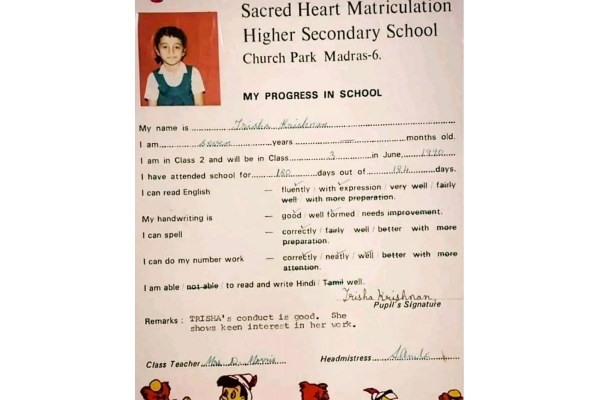 இந்நிலையில் திரிஷாவின் பள்ளி பருவ புகைப்படங்கள் அடிக்கடி இணையத்தில் வெளியாகி கொண்டிருக்கின்றன. அவ்வகையில் தற்போது மூன்றாம் வகுப்பு ரிப்போர்ட் கார்டு புகைப்படம் ஒன்று இணையத்தில் வைரல் ஆகி வருகிறது. அது பழைய புகைப்படம் என்றாலும் அதனைப் பார்த்து ரசிகர்கள் பலரும் திரிஷா எவ்வளவு க்யூட்டா இருக்காங்க எனக் கூறி அந்த புகைப்படத்தை வைரலாக்கி வருகிறார்கள்.