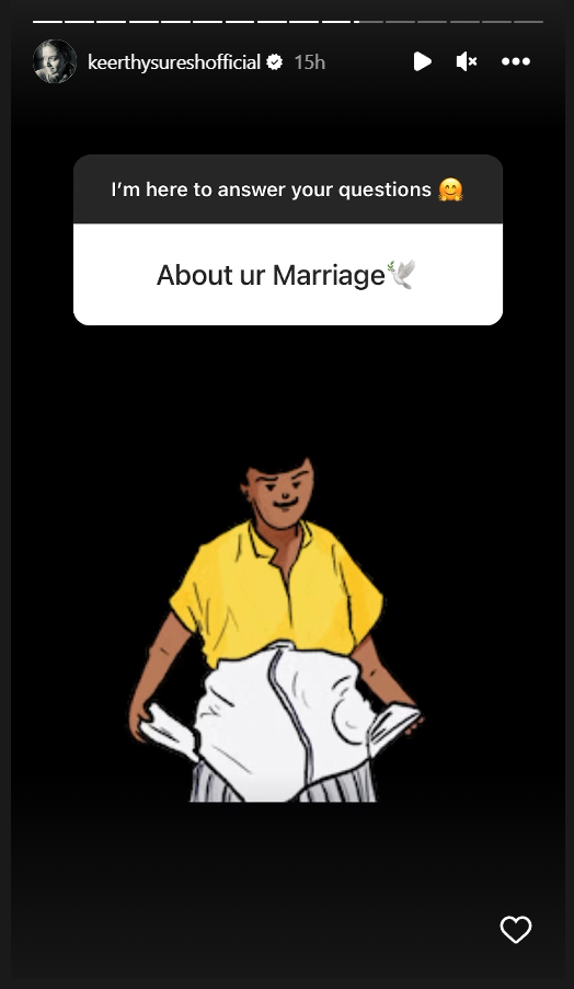 இந்நிலையில் கீர்த்தி சுரேஷ் நேற்று இன்ஸ்டாகிராம் பக்கத்தில் ரசிகர்களின் கேள்விக்கு பதில் அளித்தார். அப்போது ஒருவர் திருமணம் பற்றி கேட்க அதற்கு பதில் சொல்ல ஒரு வடிவேலு போட்டோவை கீர்த்தி சுரேஷ் பதிலாக கொடுத்துள்ளார். ஒரு தொழிலதிபருடன் கீர்த்தி சுரேஷ் காதலில் இருந்து வருவதாகவும் விரைவில் திருமணம் என சமீபத்தில் பல செய்தி இணையத்தில் உலா வந்ததை தொடர்ந்து கீர்த்தி சுரேஷ் தற்போது இந்த பதிலை கூறியுள்ளார்.