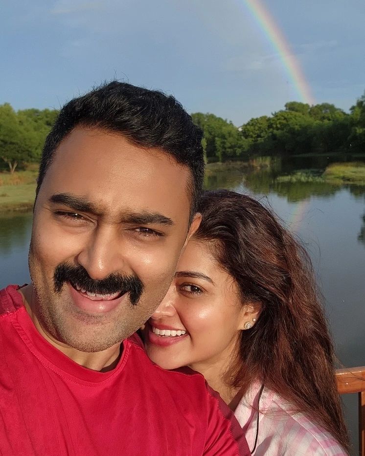 வெயிலுடன் சேர்ந்து மழை பொழிய…. வானவில் தோன்ற…. தனது அன்பான கணவருடன்…. 41 பிறந்தநாள் கொண்டாடும் சினேகா….!!!!