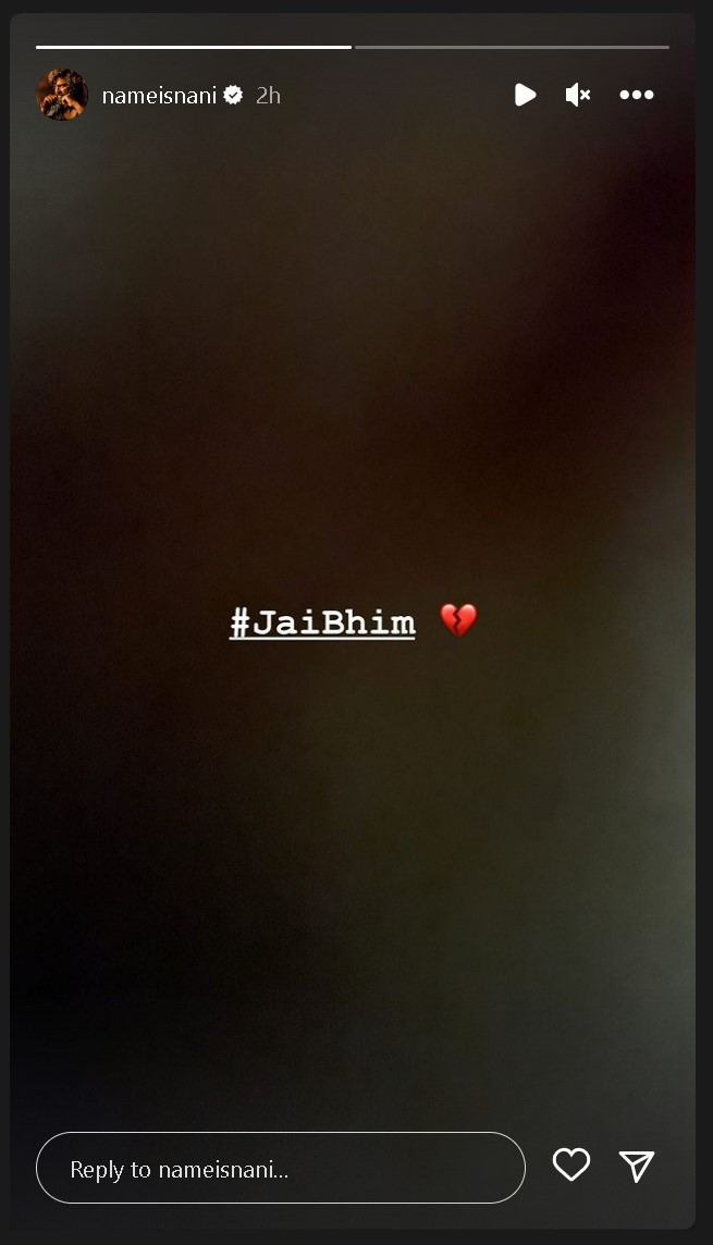 தமிழ் சினிமாவில் விருது பெரும் என எதிர்பார்க்கப்பட்ட பல திரைப்படங்களுக்கு ஒரு விருது கூட அறிவிக்கப்படாதது தமிழ் சினிமா ரசிகர்களுக்கு மத்தியில் கடும் ஏமாற்றத்தை கொடுத்துள்ளது. இந்நிலையில் தெலுங்கு நடிகர் நானி இன்ஸ்டாகிராம் ஸ்டோரில் ஜெய் பீம் திரைப்படத்திற்கு விருது கிடைக்காதது பற்றி பதிவிட்டுள்ளார். அவர் இதயம் முடிந்து விட்டது போன்ற எமோஜி ஒன்றையும் பதிவிட்டுள்ள நிலையில் தற்போது அந்த பதிவு வைரலாகி வருகிறது.